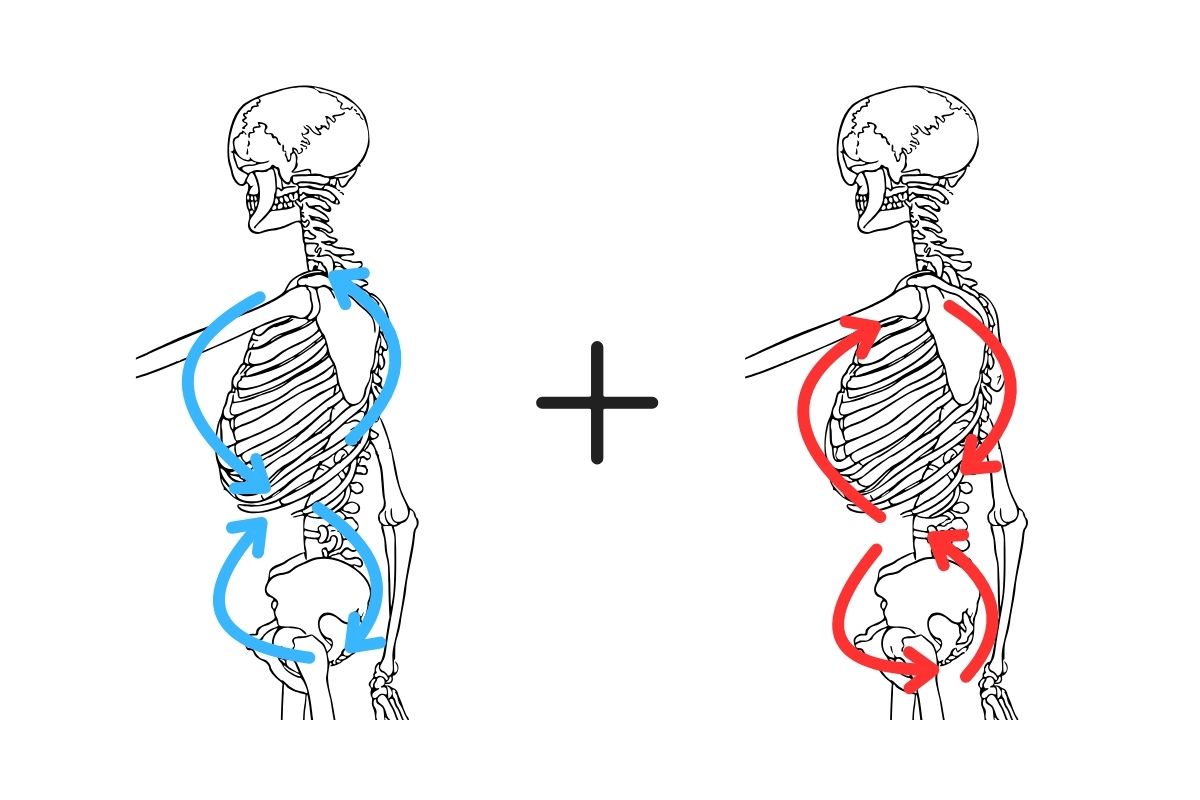 股関節とその動きから始めて積み木のように積み上がっている背骨のひとつひとつを少しずつ曲げて、釣り竿がしなるように全体で曲げている