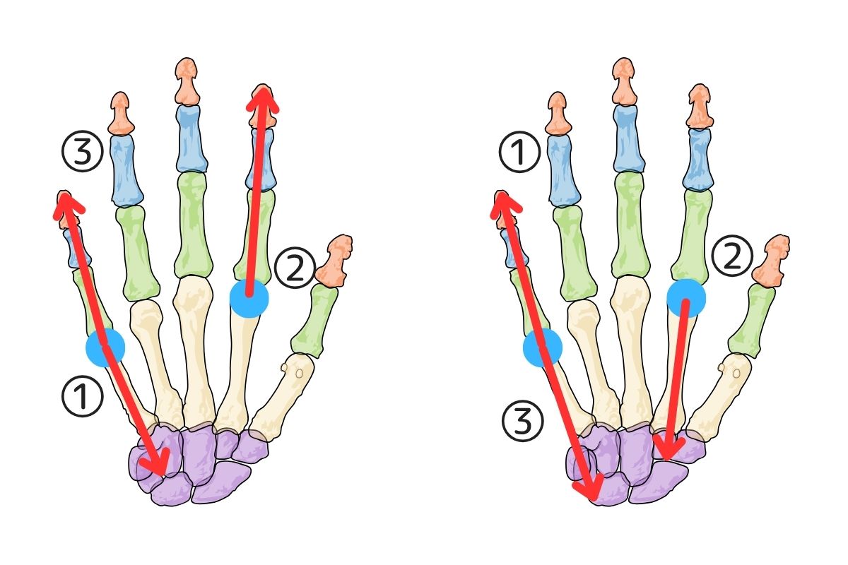 人差し指の付け根を前腕に近づけるように起こすと良いかもしれません。人差し指の付け根に小指の付け根が寄ることにあわせて、指の付け根にアーチができ、人差し指の付け根が手首に向かって押し出されるように寄ることが実感できるはず。