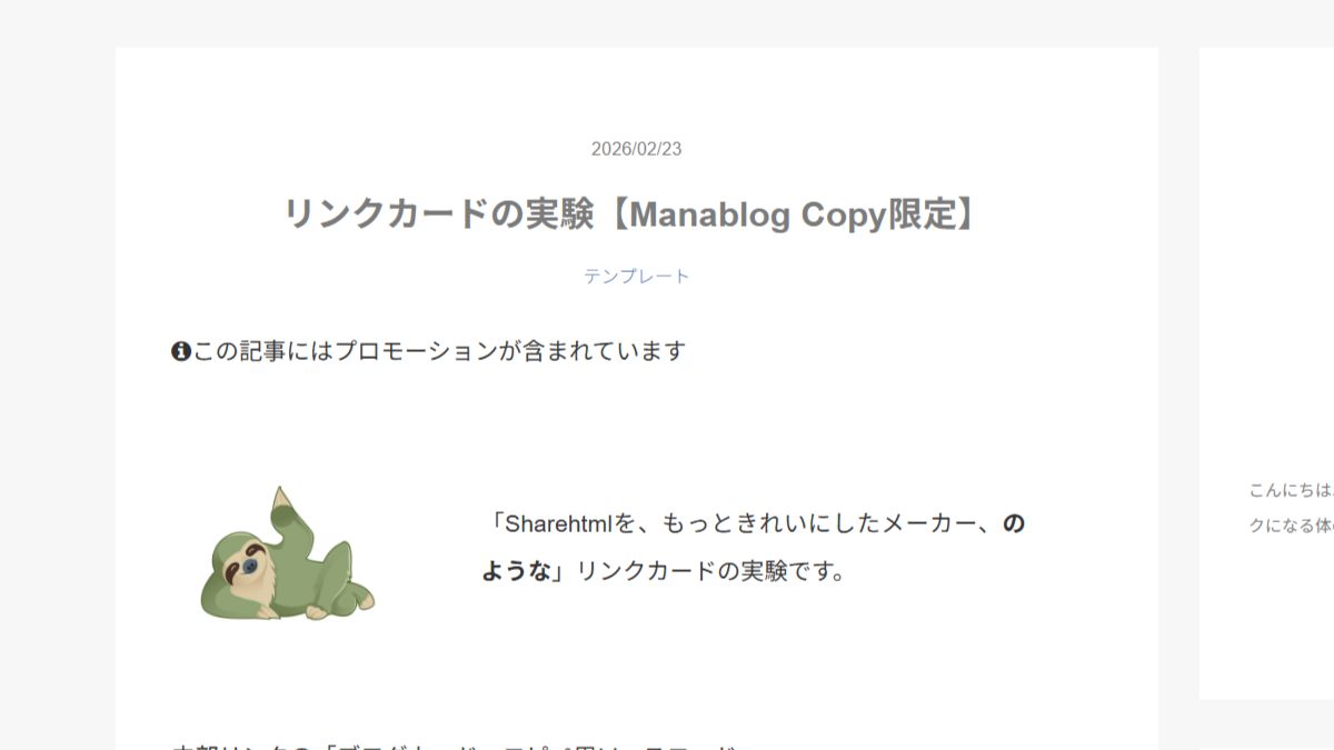 『Manablog Copy』を買ったときについてくる「ナマケモノ吹き出し」のテストです。本記事でレスポンシブ対応にできます。ぜひどうぞ。