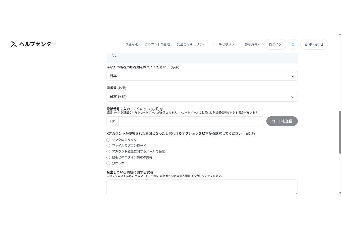 電話で認証コードが受け取れないのであれば、そのロックされたアカウントにログインしてからヘルプをクリックし、「アカウントのロックまたは凍結に関する異議申し立て」をすると、くるまえびさんの記事のような項目を入力することができます。