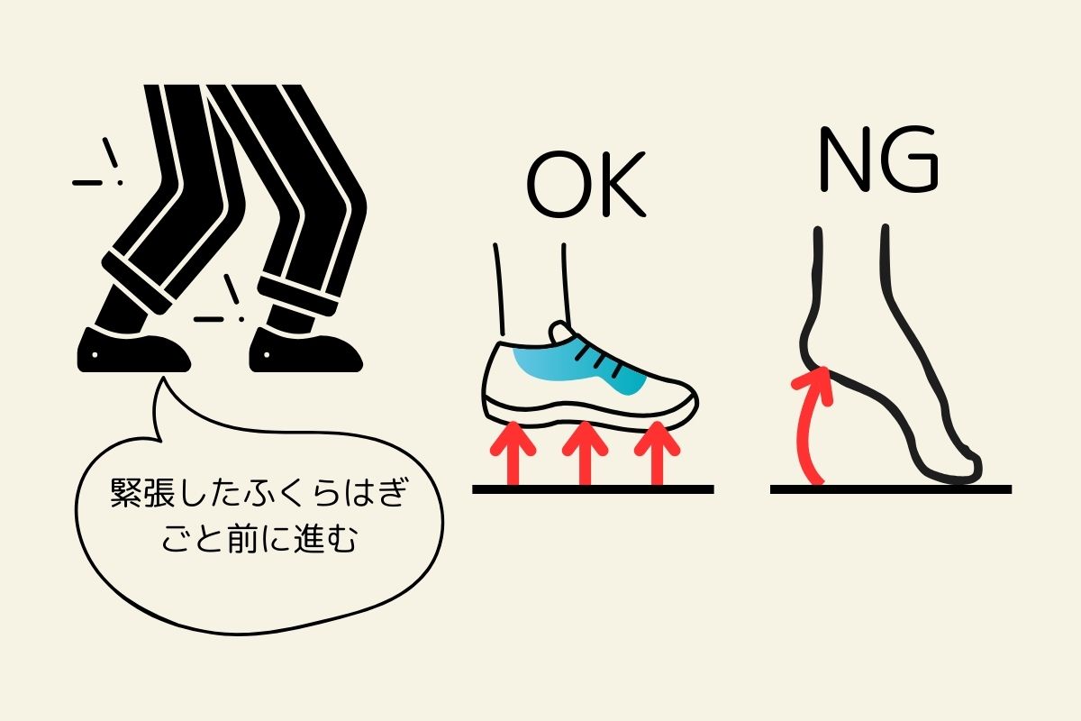 緊張からの力に任せて前に進むのではなく「後ろに倒れるときに脚が上がる」という性質からの股関節の主体にした動きが歩くときにふくらはぎを緊張させて足首を固めながらもそれを最小限にするのである。